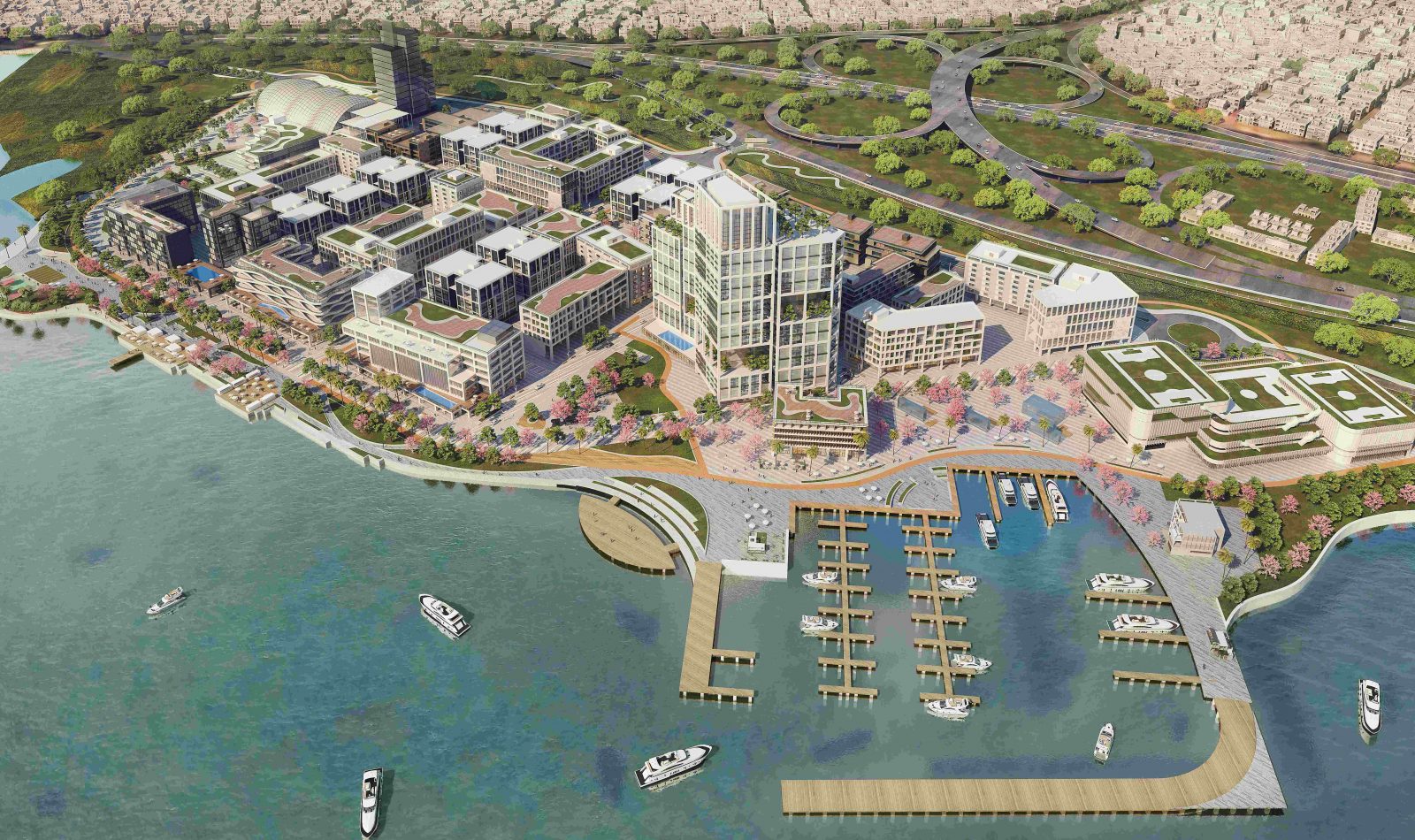 Entering the development from the north, visitors will find themselves in an area overlooking the shimmering waters of the lagoon, the Third Mainland Bridge glinting silently in the distance. A harbor designed for 50 small and medium-sized craft – including water taxis and launch jetties for lagoon commuting – adjoins a yacht club which offers sailing enthusiasts access to technical facilities as well as lounges, bars and cultivated places to relax.